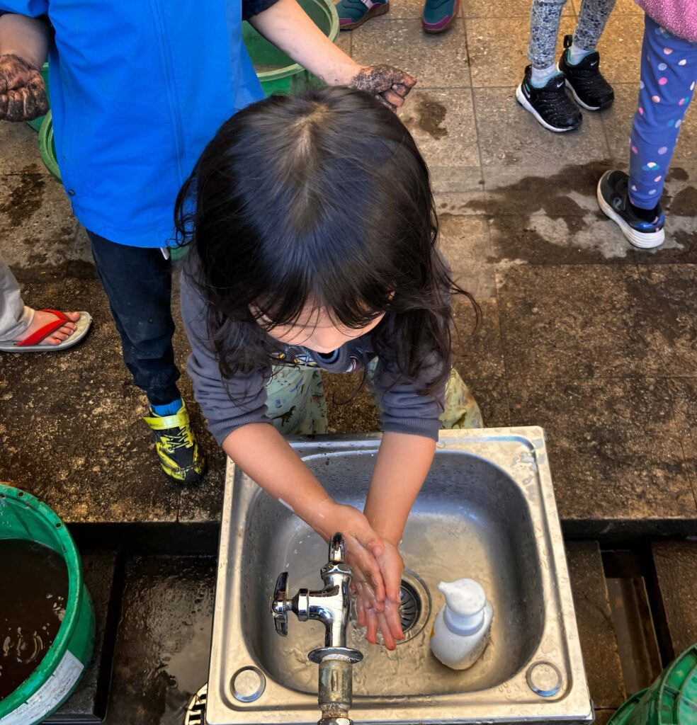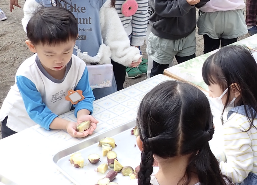 蒸したお芋はバットにきれいに並べられ、「お芋やさん開店でーす!」の元気な声が園庭に響きます。遊んでいた子どもたちは石鹸で手を洗い、列に並びます。「手を洗いましたか?」という店員さんの問いかけに、「はい!洗いました!」と答えて、お芋を受け取ります。