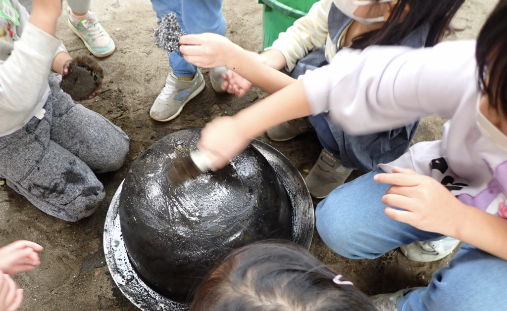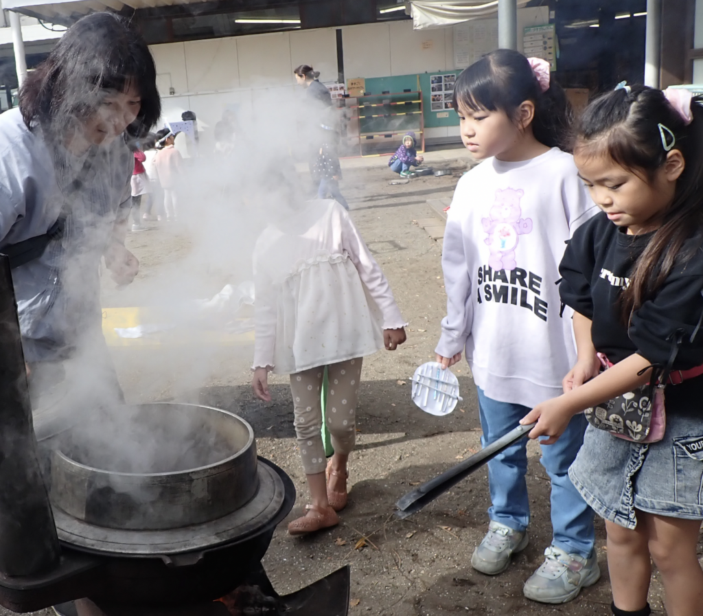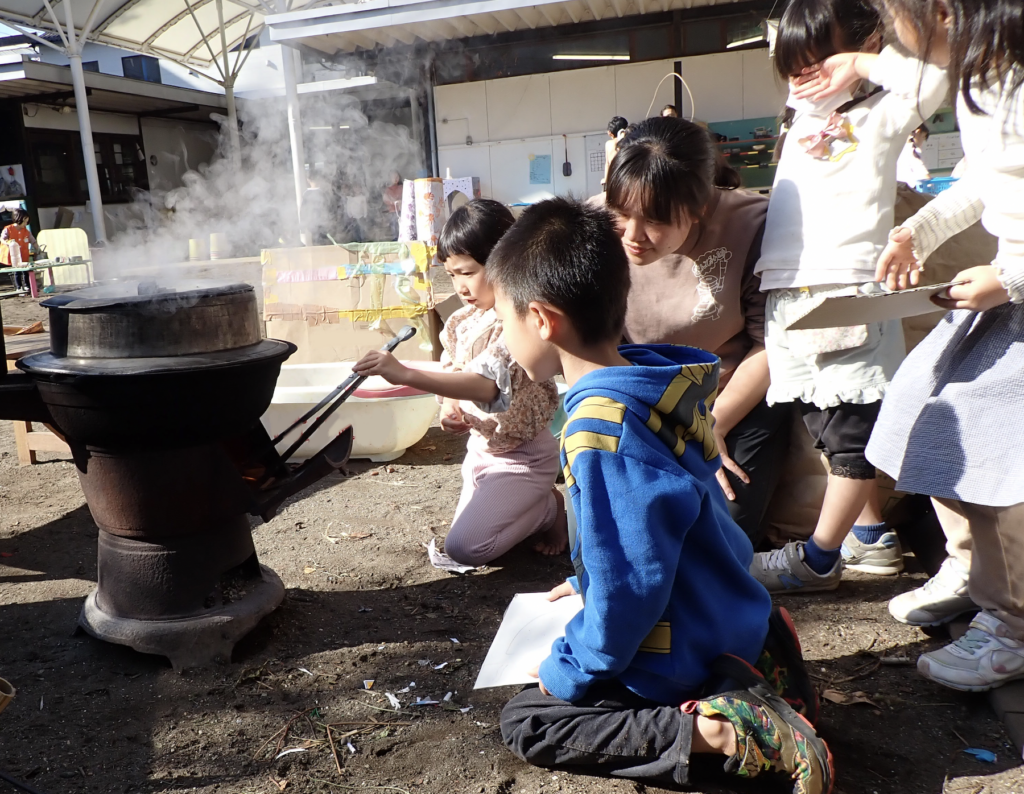 翌日には園庭にかまどを出して、毎日のようにお芋を蒸す光景が見られるようになりました。「お芋を蒸したい!」という子どもたちが集まると、かまどに羽釜をのせて、お芋を入れて火をおこします。大人と一緒に火の扱いに気をつけながら、煙が目にしみる経験もしつつ、じっくり1時間ほど蒸していきます。良い匂いが漂ってくると、菜箸をさして柔らかさを確かめ、「もういいんじゃない?」と声が上がれば、みんなで味見をして蒸し具合を調整します。蒸し上がると、次はお芋屋さんの開店準備です。