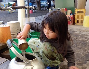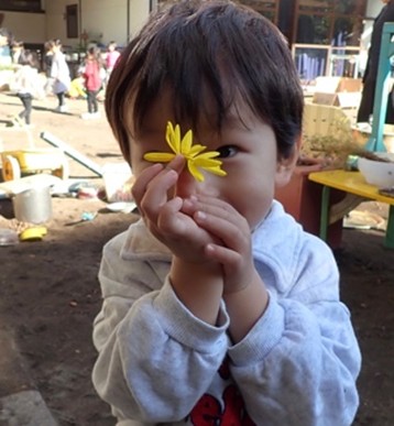 3歳児のオレンジさんは、大きなやかんにコップで水を移す作業に没頭しています。また、園庭に咲く黄色い花を見つけ、その美しさを全身で喜ぶ姿も。お気に入りの土を黙々と集める子、テーブルいっぱいに料理を並べてウキウキとパーティーを始める子――。そこには、自分の「好き」と対話する豊かな時間があります。