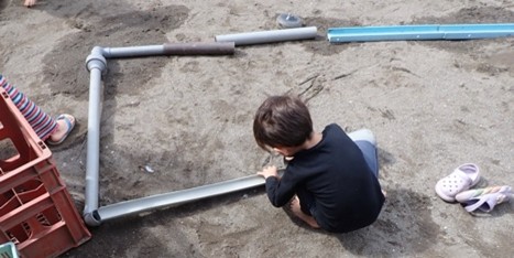 4歳児のキイロさんになると、遊びは「表現」と「探究」へ広がります。仲間の前で仮面ライダーショーを披露し、最後には握手会まで開いて交流を楽しむ男の子たち。また、樋(とい)やパイプをつなげて水の道を作り、流れ方を長い時間研究し続ける子。木工コーナーでは、金槌を操るコツを掴み、釘を打つ感触に夢中になっている姿もあります。