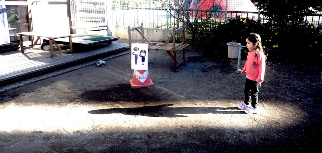 また、もう一枚の写真にも、冬の陽光を背に受けたオレンジさんが写っています。ビルの隙間から園庭に差し込む陽の光が、地面に影を落としたその刹那。オレンジさんは「はっ!」と息を呑み、立ち尽くしました。初めて自分の影と出会い、世界が新しく立ち上がった瞬間です。そこには、過去も未来も消え去り、「これは何だろう!」という驚きに満ちた「いま」だけが無限に広がっていました。