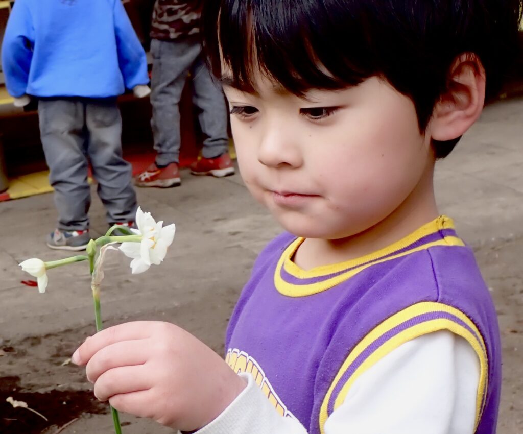 そんな中、一枚の写真が捉えたのは、オレンジさん(3歳児)が水仙と出会った瞬間です。その子は、ただそこに在る水仙の美しい佇まいに心を預け、吸い込まれるように見つめていました。優しく、そっと包み込むような指先。それは、対象を分析する「我とそれ」の視線ではなく、水仙そのものを全霊で受け入れる、時間を超越した対話の姿でした。